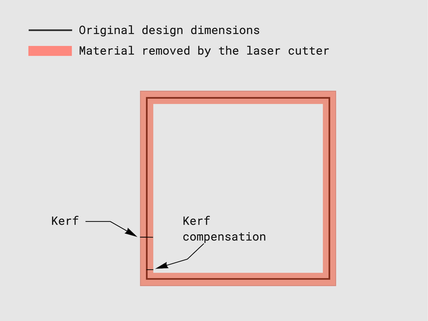 To compensate for this small amount of removed material, we need to offset the cutting paths of our designs. This is called kerf compensation.
